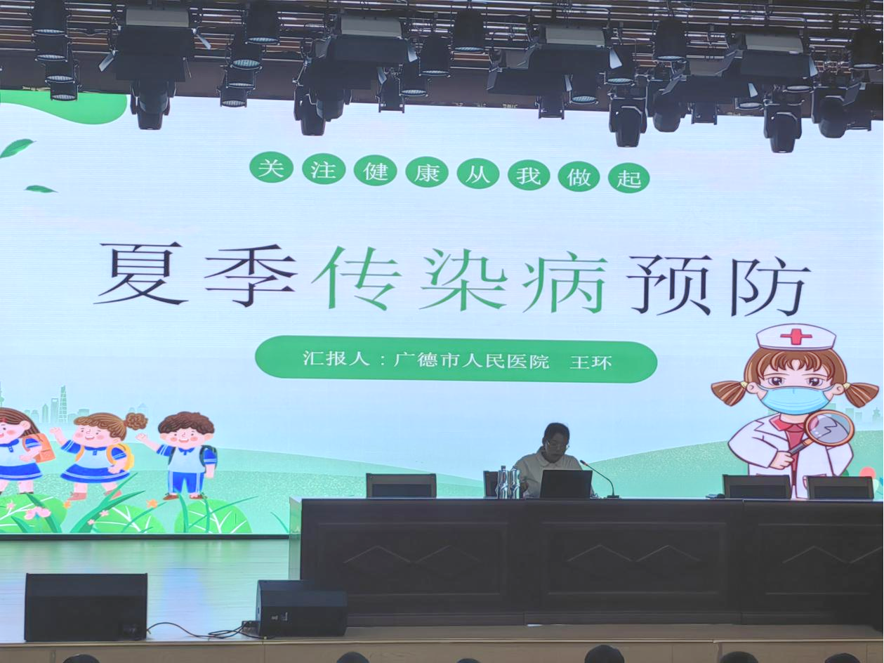 主讲人王环从“夏季传染病多发的原因”开始,介绍了流行性感冒、感染性腹泻、蜱虫病等夏季校园常见传染病,并指导学生采取远离传染源、勤洗手、开窗通气、接种疫苗、充足睡眠、均衡营养等措施,以预防传染病。