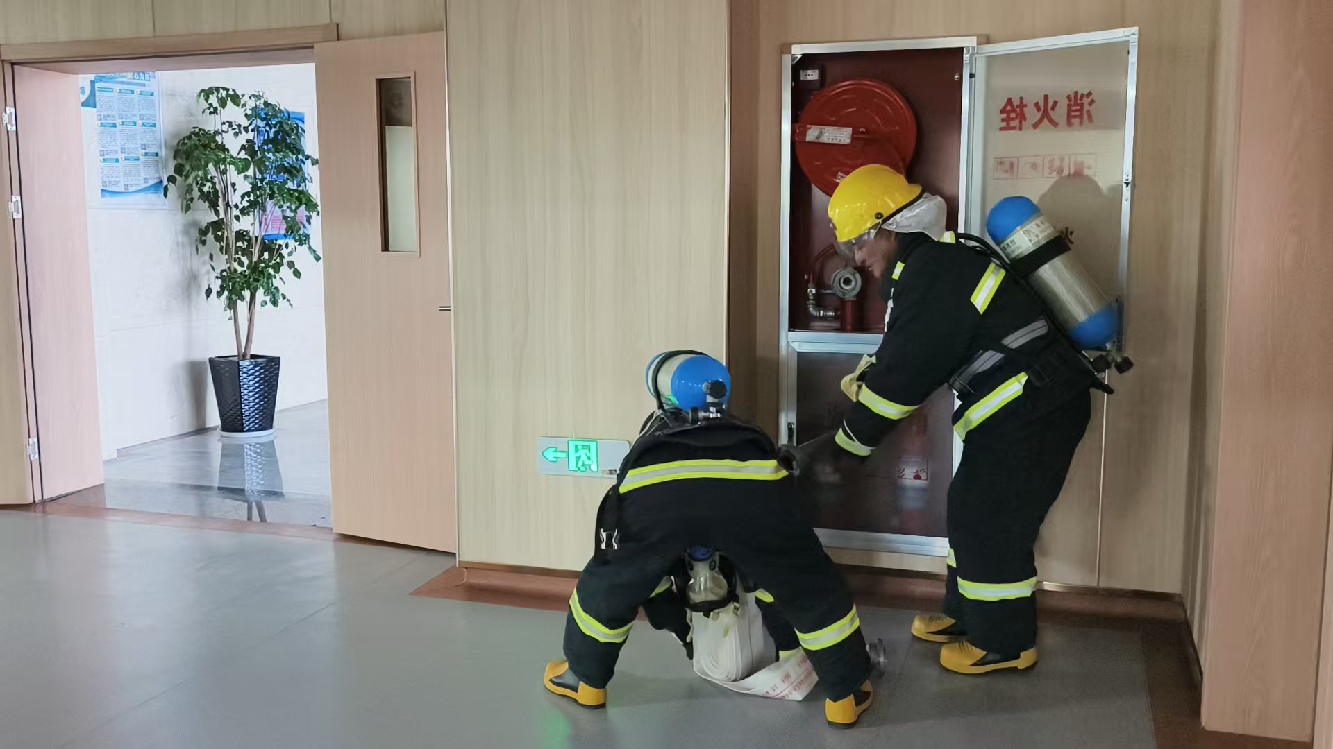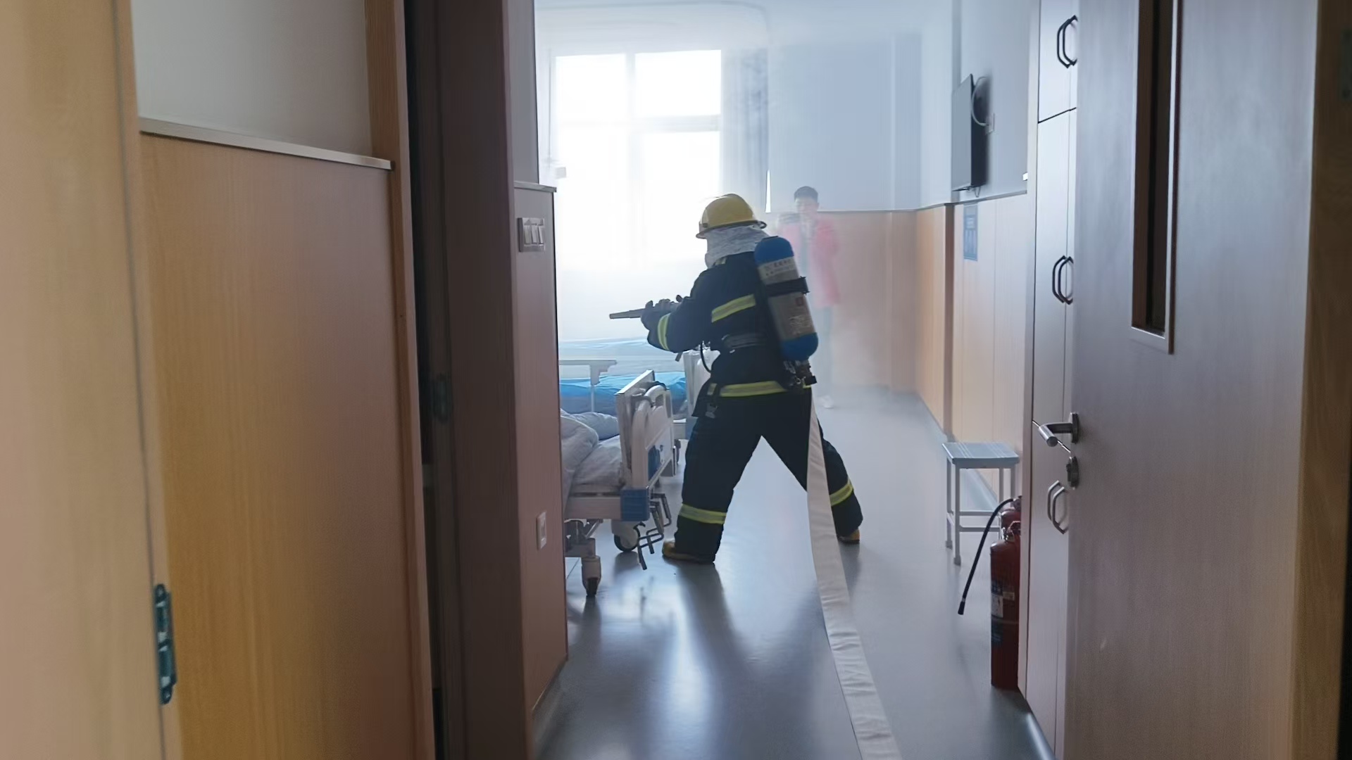 演练模拟科室突发“火灾”,工作人员立即双向报警。科主任现场指挥,医护人员分工开展初期灭火、有序疏散、危重患者转移等演练。微型消防站启动125响应机制,快速控制并扑灭“火情”,整个演练全程高效规范。